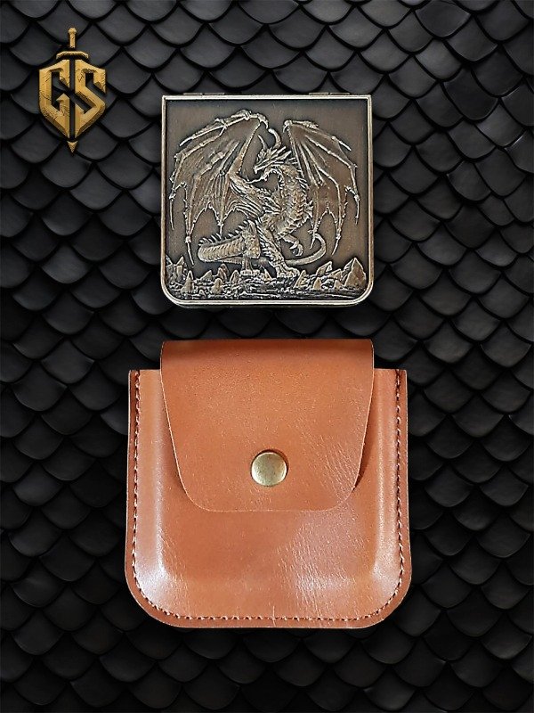 La caja se cierra con imán, firme como un cofre arcano… y todo llega guardado en su funda de cuero sintético, perfecto para acompañarte campaña tras campaña.