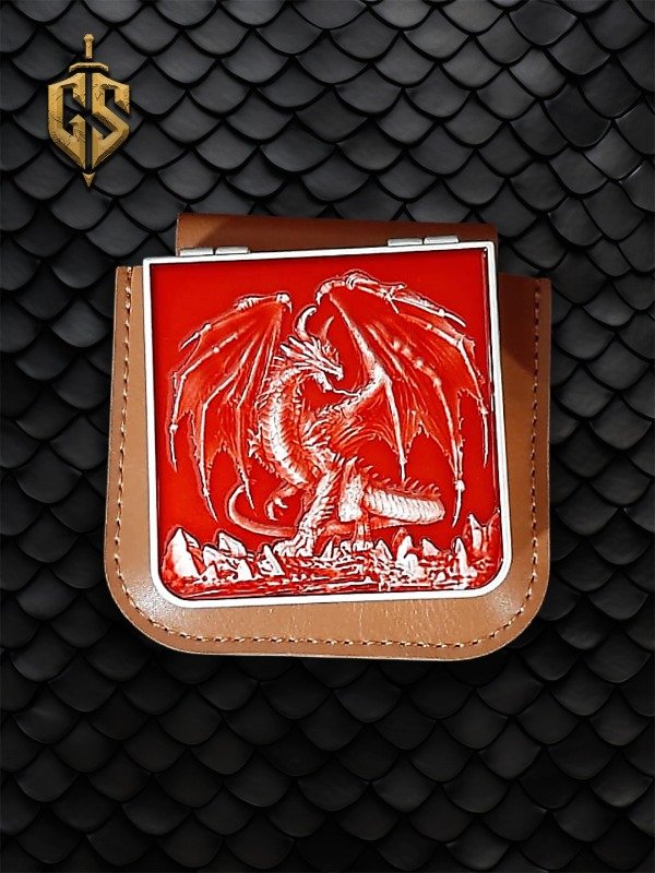 La caja se cierra con imán, firme como un cofre arcano… y todo llega guardado en su funda de cuero sintético, perfecto para acompañarte campaña tras campaña.